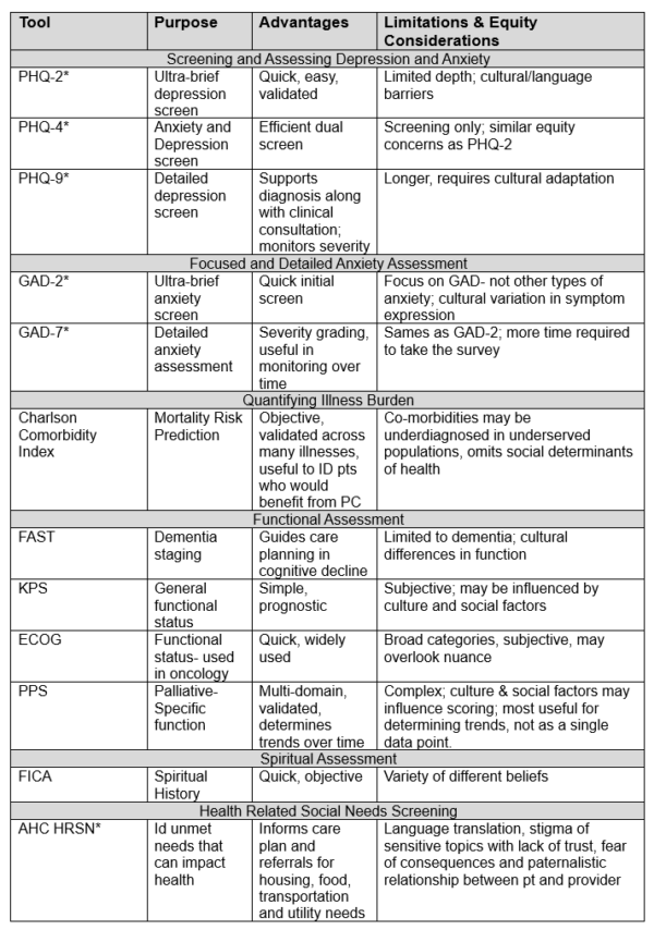 A recent blog post from the Center to Advance Palliative Care (CAPC) discusses many of the assessment tools used in palliative care. Assessment tools “not only help in making informed and objective clinical decisions but also ensure that care is tailored to each individual patient’s preferences and circumstances.” One also needs to use clinical judgment and consider how cognition, culture and social determinants of health can impact a patient’s response and how the tool should be interpreted. Assessment tools are best used to monitor a patient over time. Here is a table from the CAPC Blog to help you identify what assessment tool is commonly used, its benefits and some of its limitations to consider as you use the tool.